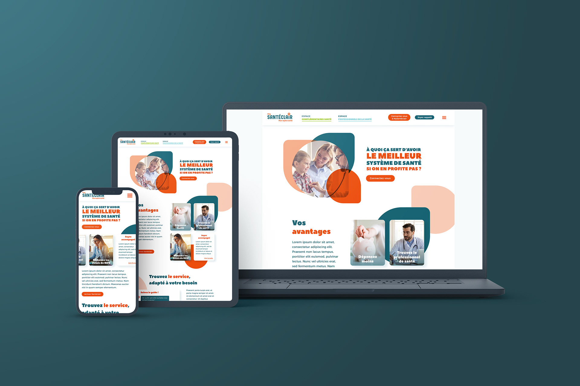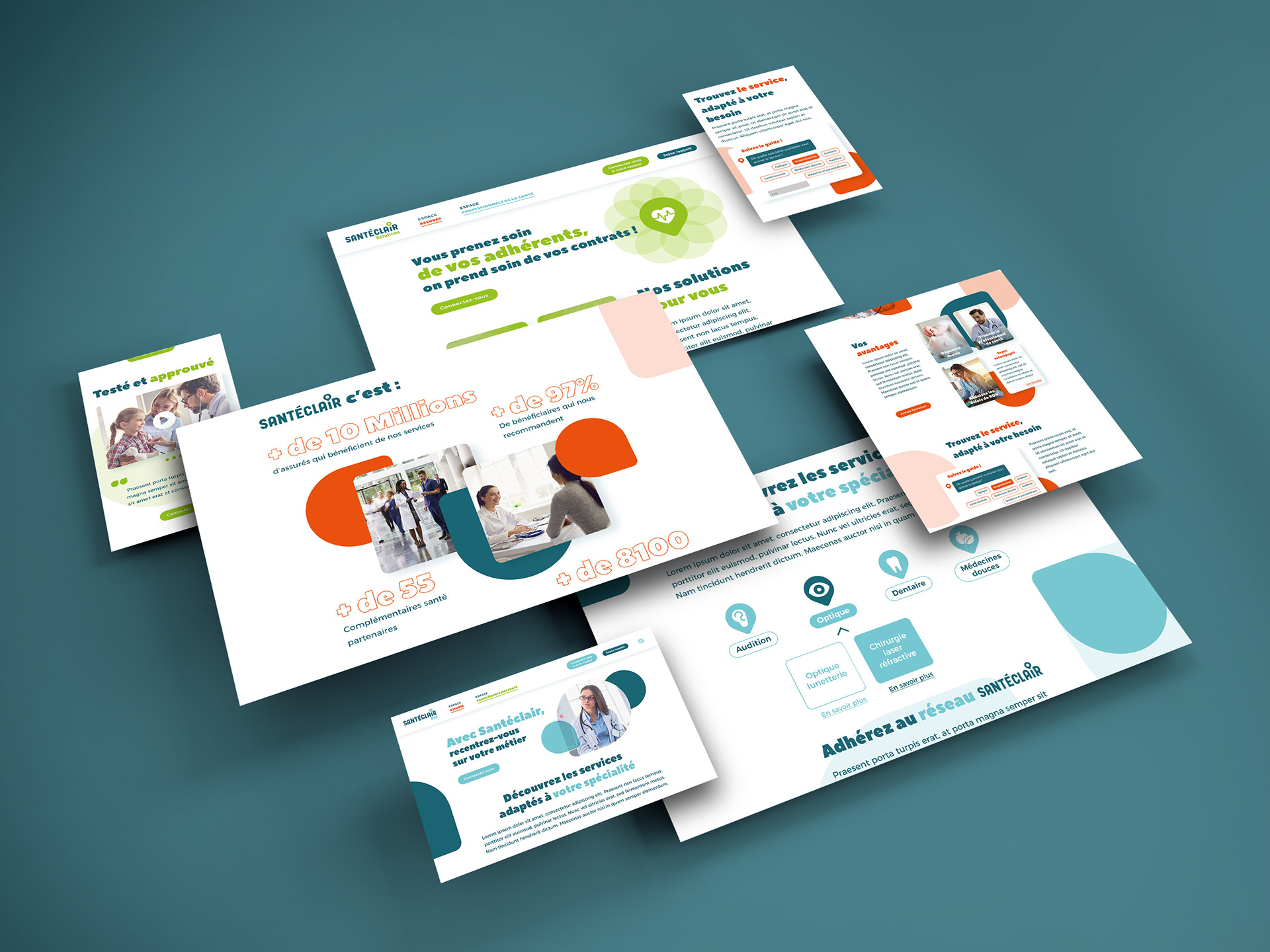 Direction artistique digitale pour réponse à l'AO Santé Clair. Création de plusieurs pages en version desktop et mobile. Client : SantéClair Agence : Publicis Activ