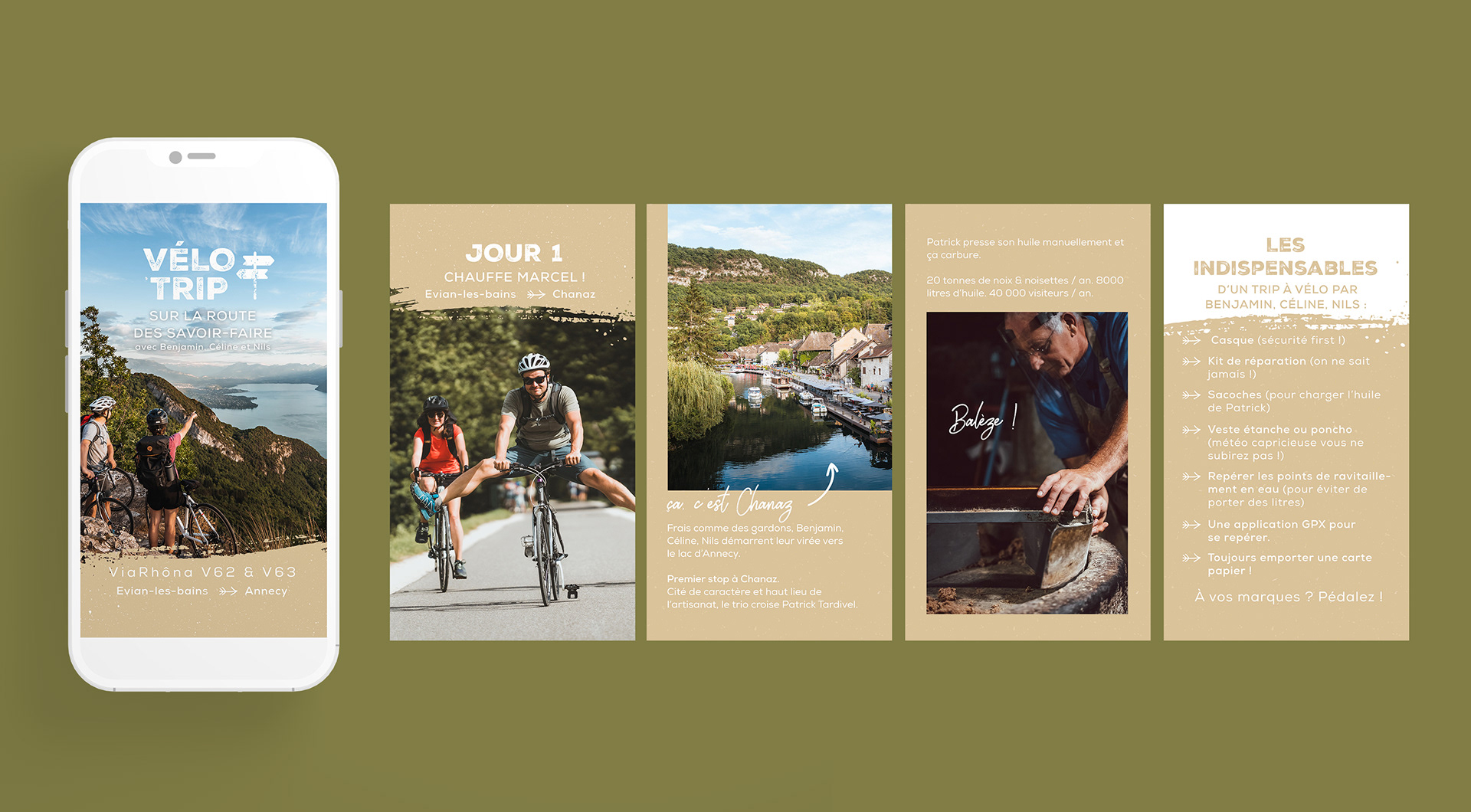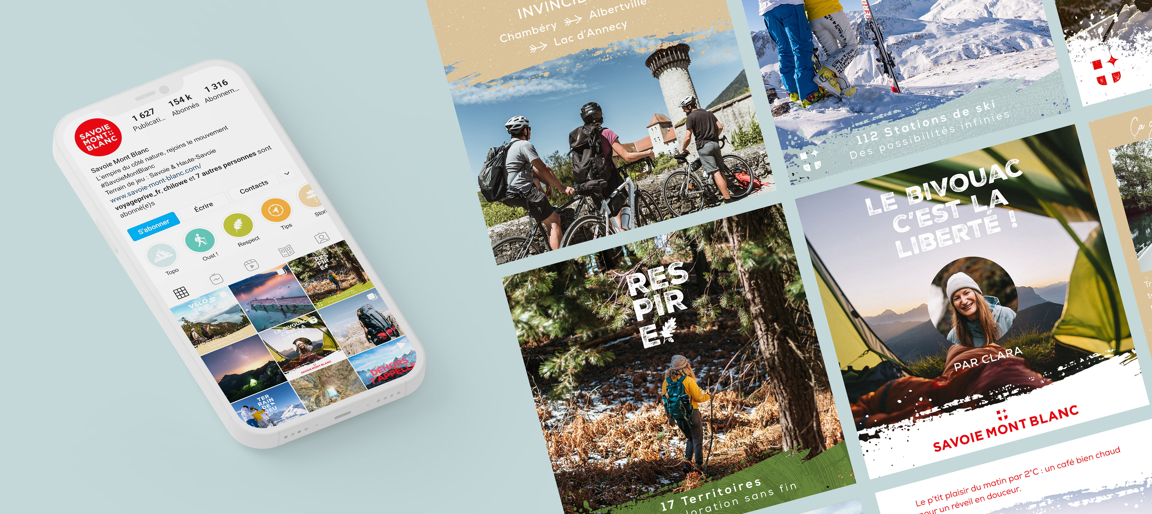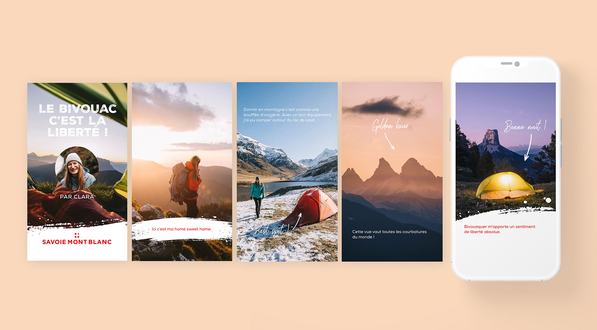 DA social media pour Savoie Mont Blanc. Ramener le territoire de marque sur les contenus digitaux. Stories / template posts / Carrousels... Client : Savoie Mont Blanc Agence : We Like Travel